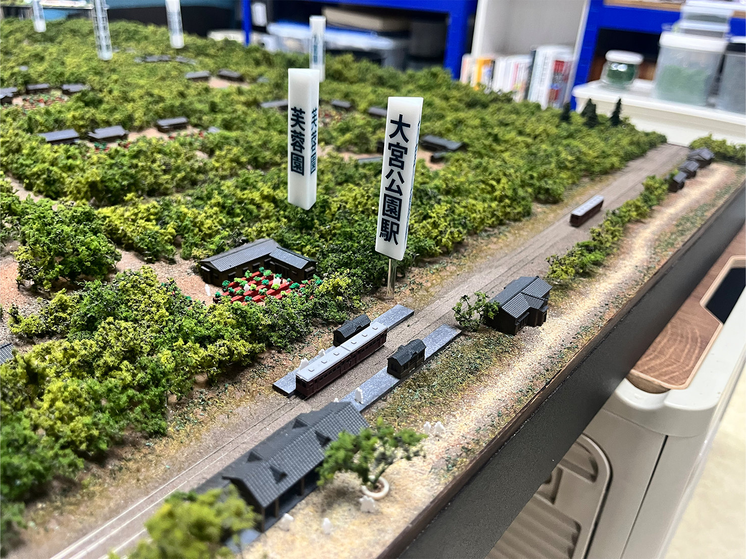 当時の街並みや住居の屋根瓦、盆栽庭園の配置など、資料や現地取材をもとに細部まで忠実に表現。